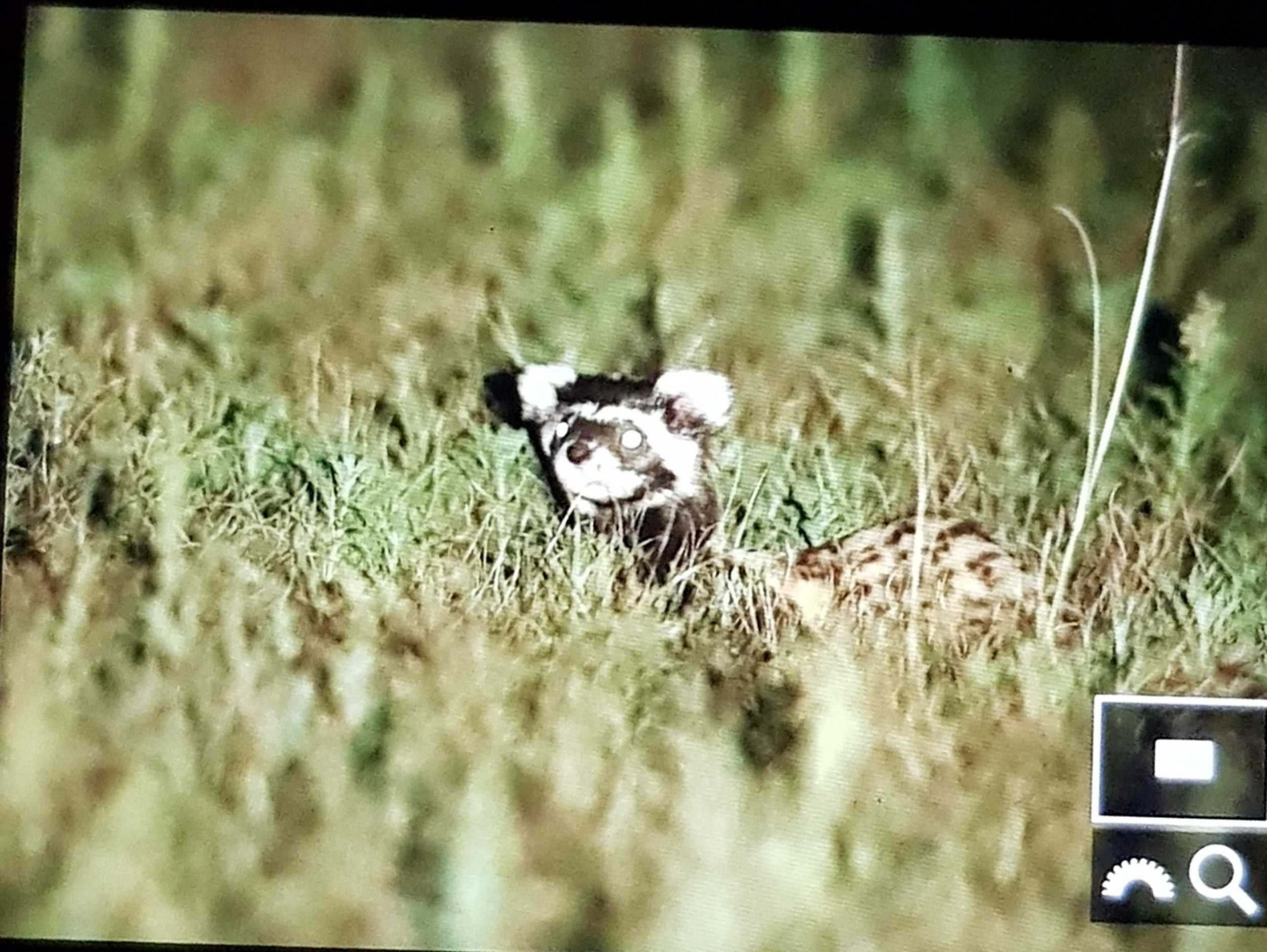 Op twee avonden nemen we na het voortreffelijke diner – bereid door de vrouw van onze lokale gids – de spotlights mee voor een rondje lampen op de steppe. Naast tientallen corsac foxes, een enkele rode vos en heel veel jerboa’s treffen we op de tweede avond de hoofdprijs. Een soort die onze lokale gids nog niet eerder zag in dit gebied én die we mooi op de foto konden zetten: de marbled polecat!