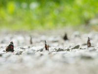 Op weg naar de volgende plek in het bos zagen we een klein koolwitje. Bij aankomst op de parking vonden we een drinkplaats van de atalanta. Maar liefst negen exemplaren zaten zich te goed te doen aan de mineralen die te vinden waren op de kale bodem. Een gedrag typisch voor bepaalde vlindersoorten, zoals ijsvogelvlinders en weerschijnvlinders. De hoop was groot en zo vonden we ook naast de woud- en bosparelmoer nog de kleine ijsvogelvlinder, de blauwe breedscheenjuffer, het icarusblauwtje, de braamparelmoer en de plasrombout.